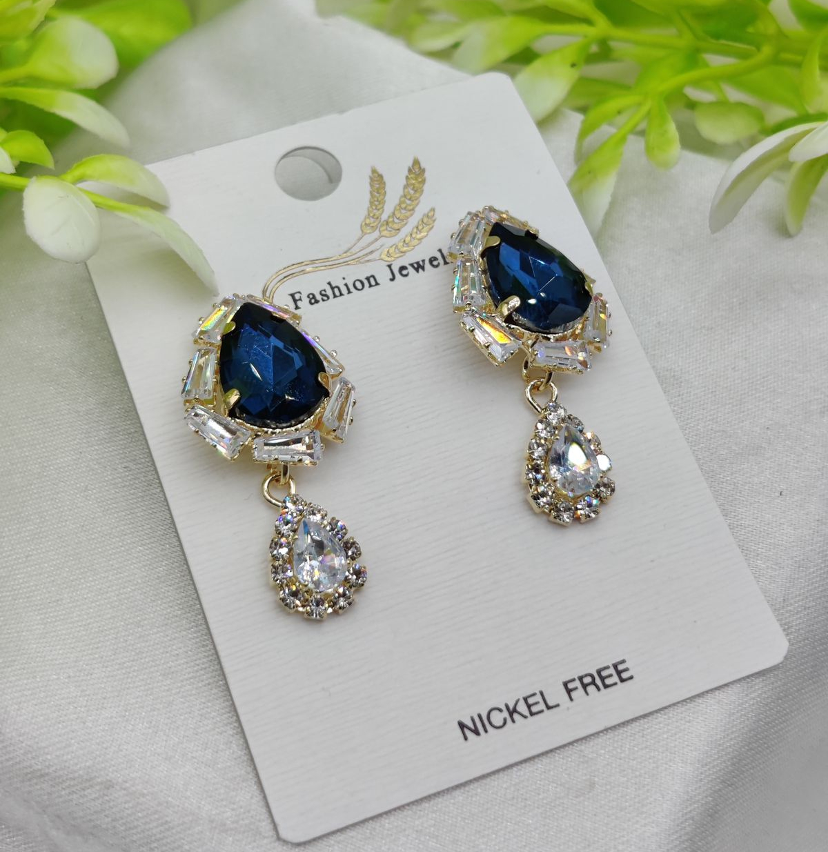 - Enhance your elegance with these stunning royal blue drop earrings featuring a luxurious teardrop-shaped centerpiece, complemented by dazzling crystal accents.